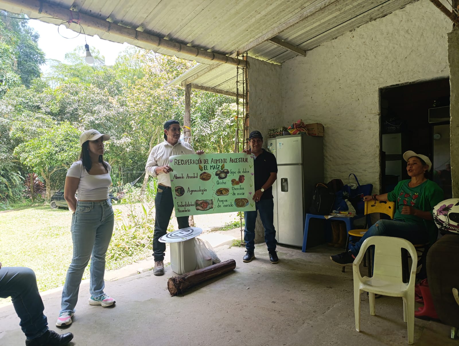 La siguiente parte del taller comenzó con algunas preguntas sobre qué es un alimento ancestral y qué significa la agroecología. Todos participaron, compartiendo sus nociones y lo que sabían sobre el tema. El taller se centraba en el maíz como alimento ancestral y en la importancia de recuperar las recetas tradicionales que se preparan con este delicioso ingrediente. A medida que la compañera Rosana hablaba sobre diversas recetas, las mujeres compartían cómo las preparaban, intercambiando ideas y consejos. La anfitriona comentó que la arepa que estábamos comiendo había sido hecha con maíz cultivado por unos vecinos que se lo regalaron, y explicó que su preparación llevó varios días.