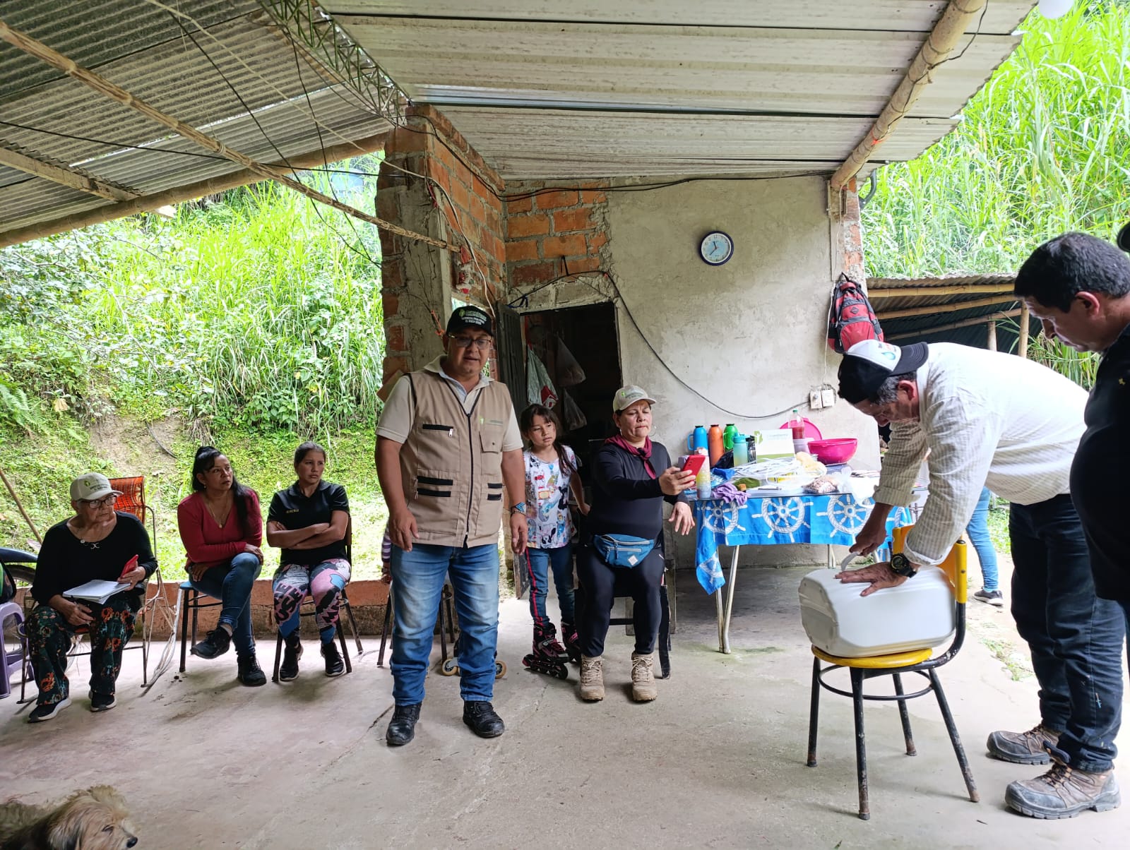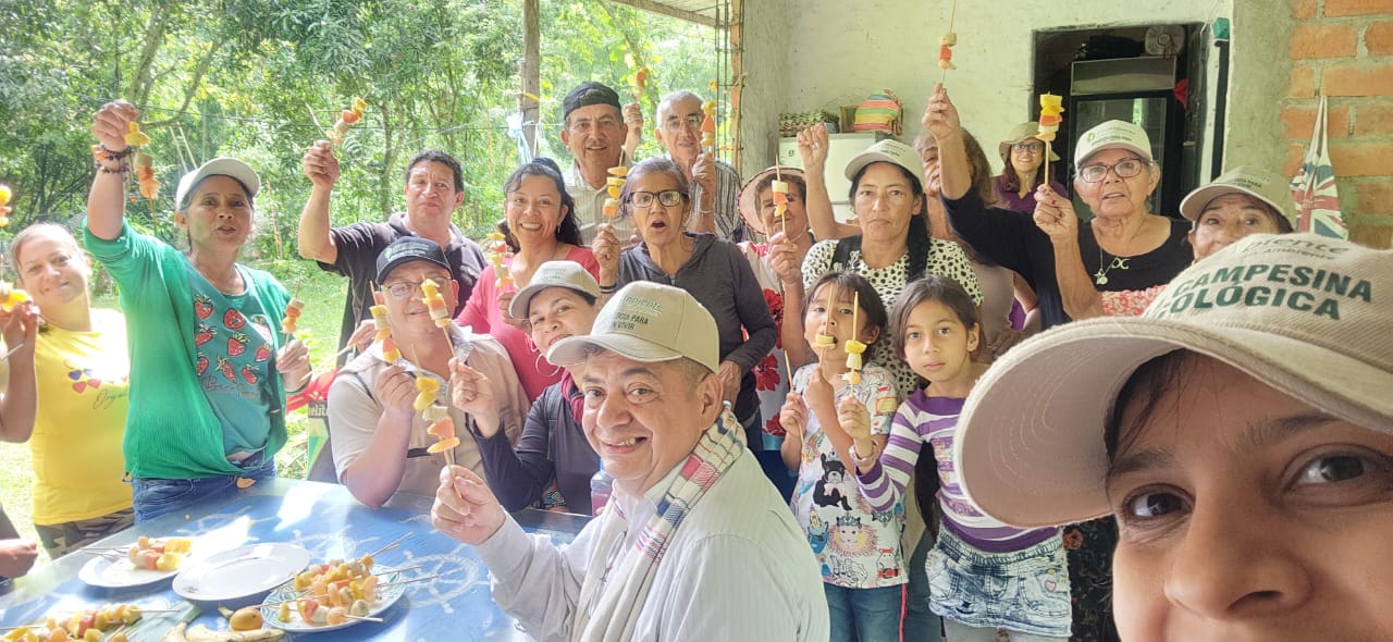Apenas llegamos, las personas anfitrionas nos recibieron con un desayuno de caldo con carne y arepa de maíz, brindándonos una bienvenida muy cálida y amable. Mientras desayunábamos, llegaron las compañeras y compañeros que faltaban, mencionando cómo las fincas están muy alejadas unas de otras, pero que entre ellos se ayudaron para desplazarse.